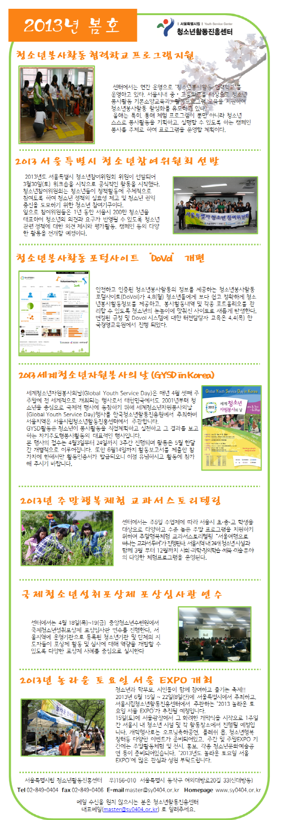수정 삭제 목록 2013년 봄호 뉴스레터 페이지 정보 작성자 댓글 0건 조회 2,145회 작성일 2013-04-25 본문 추천0 이전글2013 청소년 문화존 모니터요원 모집 13.07.09 다음글2013 대한민국청소년자원봉사단(KYVP) 합격자 발표 13.04.22 댓글 0 댓글목록 등록된 댓글이 없습니다. 수정 삭제 목록