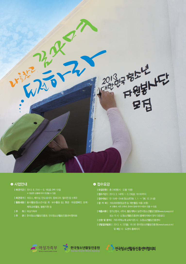 청소년들의 해외봉사활동, 문화체험 및 외국 청소년들과의 교류활동 등을 통해 사회참여 현장을 해외로 확대하고 세계시민의식 함양을 위한 “2013 대한민국청소년자원봉사단(Korea Youth Volunteer Programme)” 참가자를 아래와 같이 모집하오니 많은 신청 바랍니다.