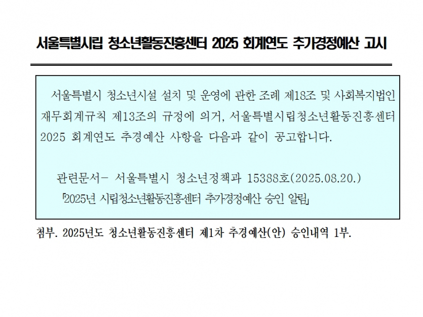 [공지] 2025년 1차 시립청소년활동진흥센터 추경예산 승인 공고