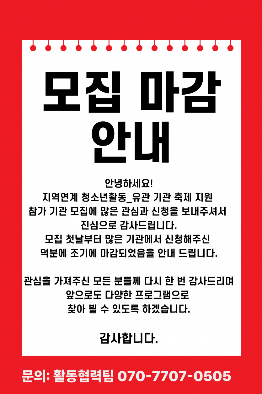 목록 검색 [안내] 지역연계 청소년활동 지원 _ 유관 기관 축제 지원 모집 마감 안내 페이지 정보 작성자 한창수 댓글 0건 조회 170회 작성일 2025-04-22 본문 . 추천0 다음글2024년 11월 안전점검 실시 결과보고 24.11.06 댓글 0 댓글목록 등록된 댓글이 없습니다. 목록 검색