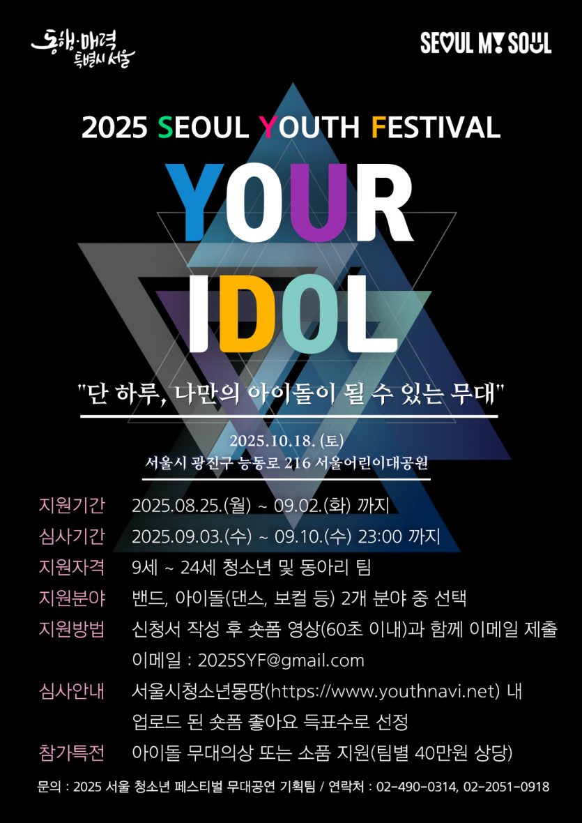 20251018() 서울 어린이대공원에서 개최되는 '2025 SEOUL YOUTH FESTIVAL <YOUR IDOL>'에 참가할 주인공을 모집합니다.