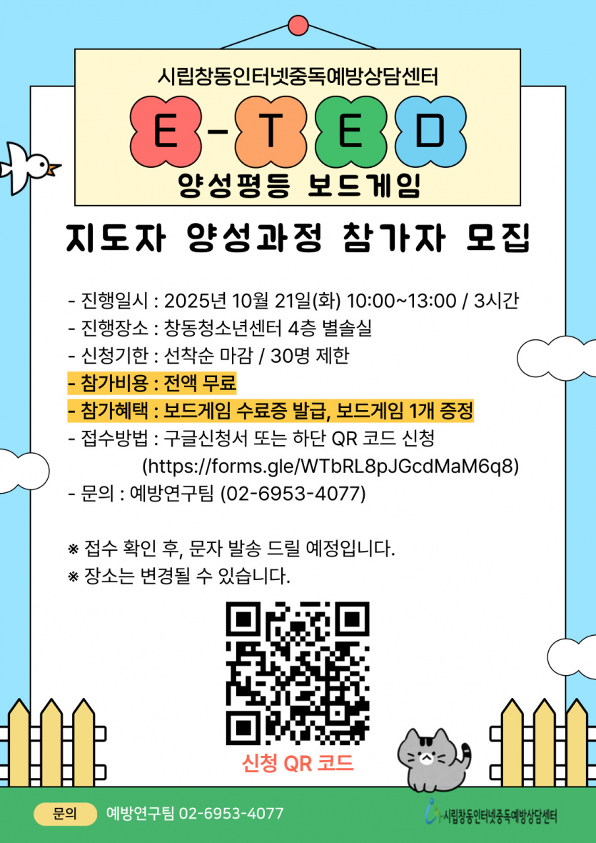 2025.10.21.(화) | 10:00~13:00 (3시간) | 디지털 양성평등 기능성 보드게임 (E-TED CAT) 지도자 양성교육 | 박성옥 (대전대학교 교수, 한국임상게임놀이학회 학회장) |