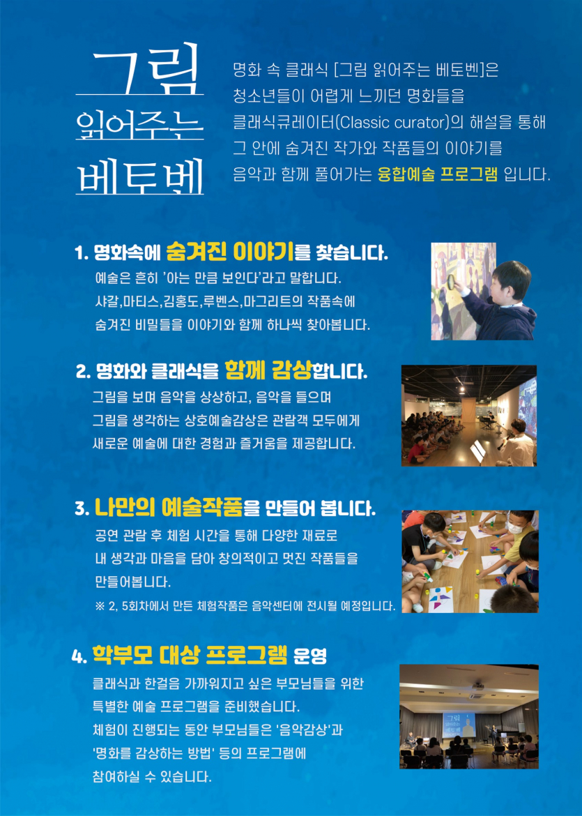 사업내용: 음악, 명화, 동화, 체험 등 다양한 장르를 접목한 관객 체험형 렉처 콘서트 진행