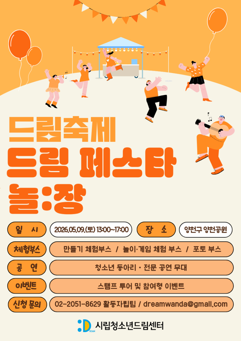 [양천구] [청소년드림센터] 2026 드림축제 '드림 페스타, 놀:장' 체험 부스 운영 및 청소년 동아리 공연 참가자 모집 안내