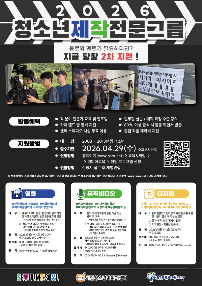 - 다음글[청소년미디어센터] 청소년기자단 '뉴스리터러시 프로젝트' 모집 26.04.22