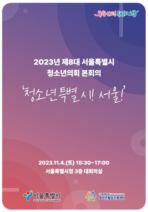 서울시 대표 청소년참여기구 2023년 제8대 서울특별시 청소년의회가 제안한 3가지 정책이 수록되어있는 본회의 자료집입니다.